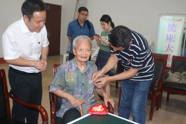 一个上午,共制作300余个香囊,除赠送在场的老人外,医学院党总支委员还分组去病房,为未能来现场制作的老人送去香囊,带去祝福。在现场,有两位90多岁的老党员,他们希望戴上党徽,庆祝党的70周岁生日,得知此事,医学院党总支书记余文富亲自为他们每人送上一枚党徽,支部书记徐春岳老师为两位老人佩戴上党徽,老人洋溢着幸福的笑容。